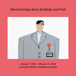 A flier with a red frame and a painting in the center. the painting is Michael Pellew: David Byrne, 2022. Acrylic on wood, 32.5h x 60w x 9d in. There is text on top that says “More Drawings about Buildings and Food” and at the bottom it says, “January 7, 2024 - February 10, 2024 (northern) Western Exhibitions, Skokie”.
