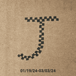 A Flyer that shows an image of a J made out of a checkered pattern with text at the bottom that says “1/19/24-03/03/24” over a brown cardboard textured background.